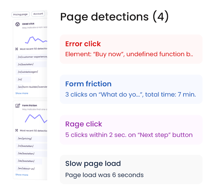 With continuous UX detections, you’ll automatically discover what’s going wrong on your website. Using more than eight frustration signals like rage clicks, frantic scrolling, form friction, and more, you’ll get an actionable dashboard, including session replays and metadata.